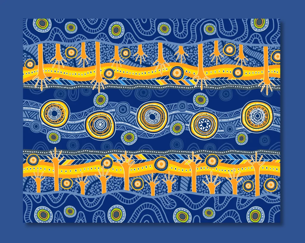 The design created for RACQ’s Innovate Reconciliation Action Plan (RAP) stands as a powerful visual expression of progress, partnership, and accountability. Developed to mark the next stage of their reconciliation journey, the artwork embodies forward momentum while honouring the enduring cultures of Aboriginal and Torres Strait Islander peoples.